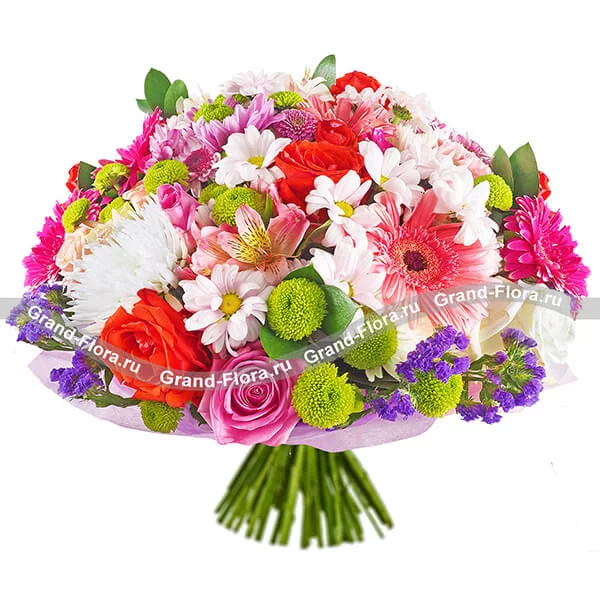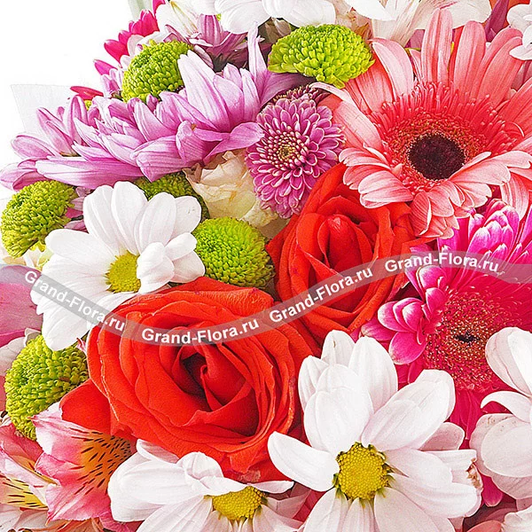 Стандартный (на фото): роза розовая - 3 шт., роза белая - 3 шт., роза красная - 5 шт., гербера розовая - 2 шт., гербера малиновая - 3 шт., хризантема кустовая (белая и розовая) - 5 шт., хризантема кустовая зеленая - 2 шт., хризантема одноголовая белая - 2 шт., альстромерия (белая и розовая) - 2 шт., статица - 1 шт., фетр фиолетовый.Диаметр букета 30х30 см.